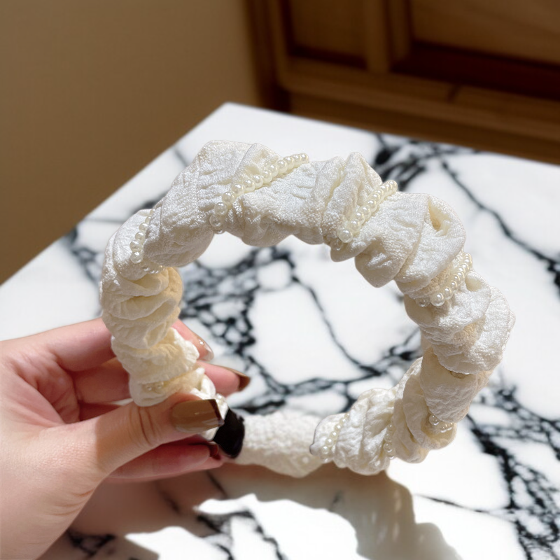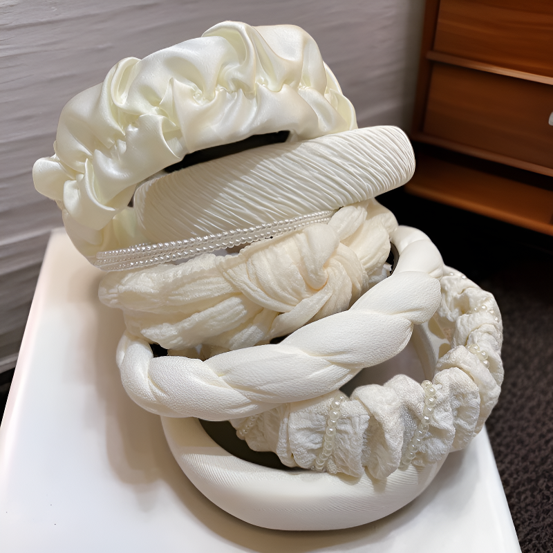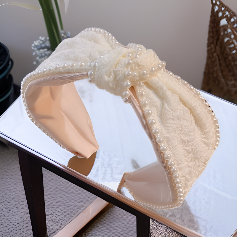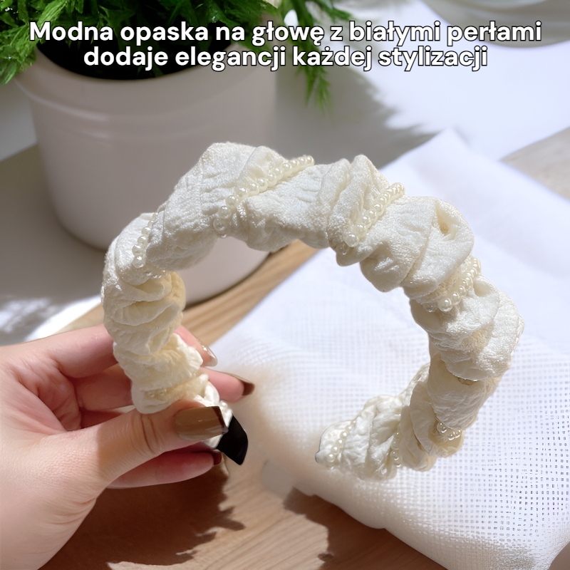 Modna i uniwersalna opaska na głowę z białymi perłami, plisowana z kokardą, wysoki fason